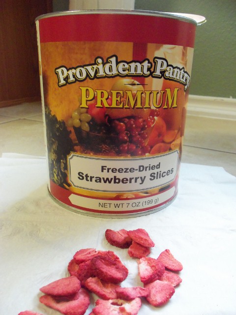 Food storaging strawberries is a little tricky for us. We don’t have a lot of freezer space, and we don’t stick around in one location long enough to cultivate a patch. So I’ve invested in freeze-dried strawberries. Advertised to last 10-15 years, my thought is that they’ll tie us over until we can get our hands on fresh ones again. At $15-$17 per can, I have no intention of using them on a regular basis. I keep 2 Costco-sized bags of berries in my freezer that we rotate through constantly, and we’ll save the freeze-dried stuff for a real emergency.