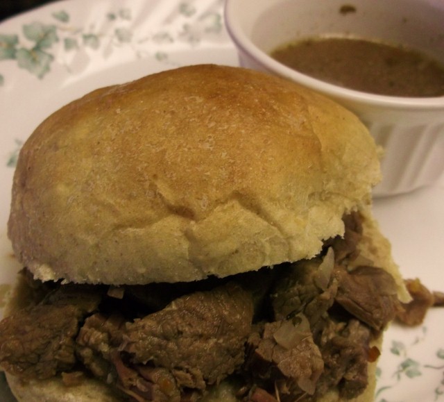 My friend’s mother, Cheryl, was a fantastic cook! This recipe is my food storage version of her original! To make her original, select a beef roast and marinate it in Italian dressing for 24-48 hours. Drain the roast and put it in a crockpot or deep baking dish. Combine 5-6 cups of water with 2 packages of Lipton Onion Soup Mix and pour it over the roast. Cook until the meat is tender. We prefer ours falling apart, but it tastes delicious sliced, too! We usually serve ours on buns. –Mellyn